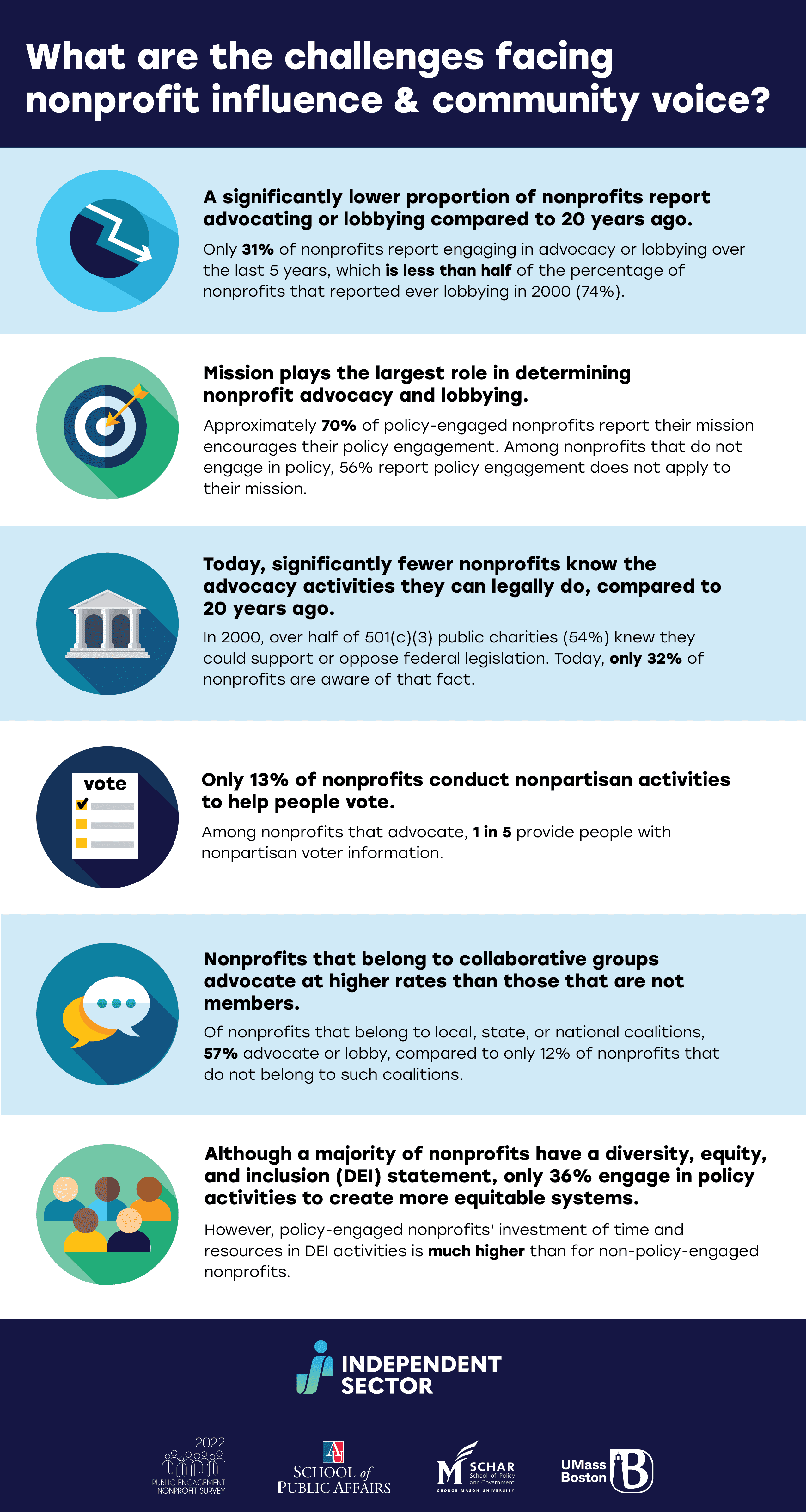 Independent Sector seeks to measure the status of a major pillar of nonprofit sector health: advocacy and civic engagement. We commissioned research to fill a 20-year gap in data around nonprofit advocacy and civic engagement (i.e., nonpartisan voter engagement) activities through a nationally representative quantitative survey and complementary qualitative interviews of nonprofit institutions. The research is designed to provide insights on how advocacy and civic engagement may vary by organization size, geography, communities served, and leadership demographics.
