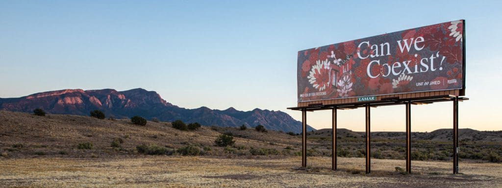 The top photo, courtesy of Unfinished, is by Jeff Scroggins. It shows “Can we Coexist?” by Jun Mabuchi, in Placitas, New Mexico. This Unfinished Network Partner project involved For Freedoms. It was part of a 50-state campaign of billboards asking artists’ urgent questions about society and humanity. Learn more about Unfinished, other Independent Sector members, and becoming an IS member.