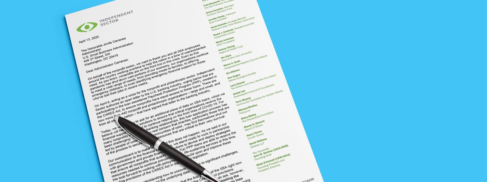 We trust you share our commitment to making certain that those whose mission it is to serve the most vulnerable across our nation have equitable access to these vital resources. Independent Sector stands ready as a partner and offers our unique insight into nonprofit and philanthropic needs, so that the SBA can help get loans to those most in need. Working together, we will get this right.